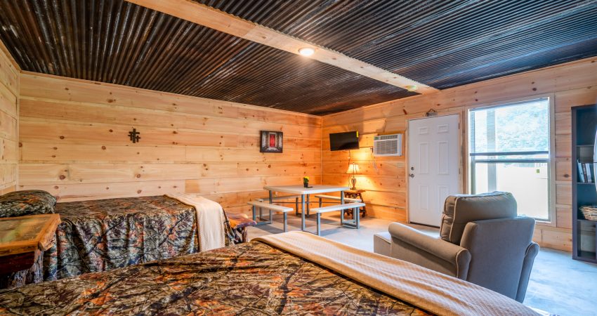 THE BUNKHOUSE IV, V, VI, and VII are all located together on Winona Road. Each Bunkhouse is a large open room that has it’s own private bathroom. Each Bunk House has it’s own full sized fridge, microwave, and coffeemaker. Features include a TV. Wi-Fi is available for purchase. No Smoking, Please. There are 2 queen beds. Combine with the other Bunkhouses and Yeti Caves to sleep 52 in one area. For your enjoyment, there is a fire pit right outside of the barn. $120 per night for 4 guests. There is an additional fee of $25.00 per night per extra person. There is a $75 cleaning fee per stay. There is a $120 security deposit that will be held on your credit card pending determination that upon departure the renter has left the cabin in the same condition as it was upon arrival, it will be released within a couple days of your departure. Please visit Cabin Rental Guidelines Page or FAQ’s Page and review our cancellation policy before booking. One Big Open Room with 2 Queen Bed | 1 TV in Each Unit | Wireless Internet Access Available for Purchase | Charcoal Grill | Fire Pit available outside | Coffee Maker | Microwave | No Smoking, Please | Nice Mountain Views | Close to Trailhead #6
