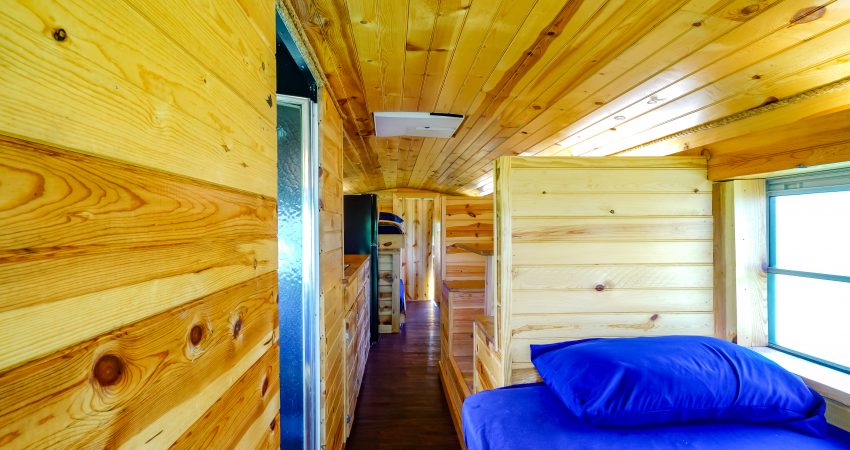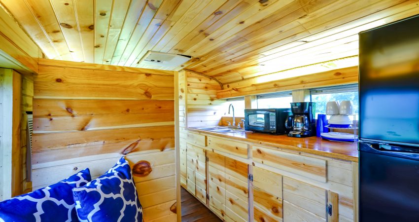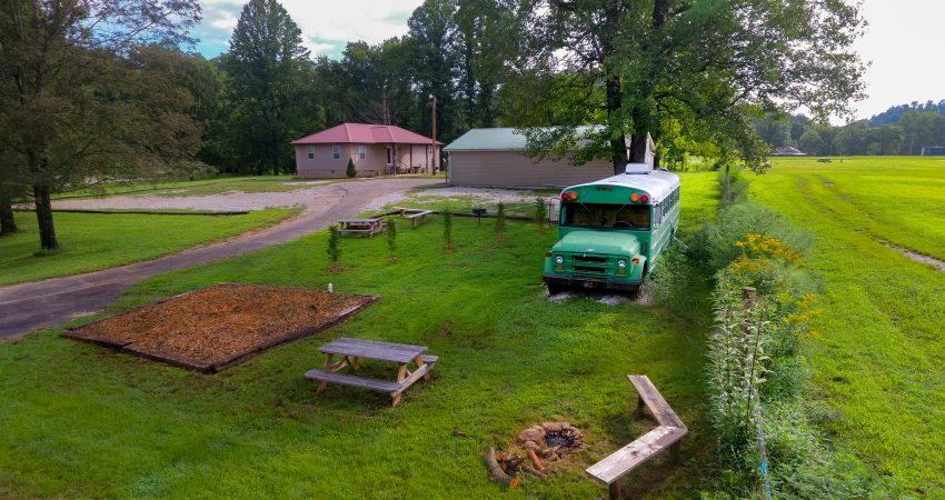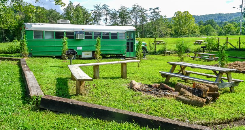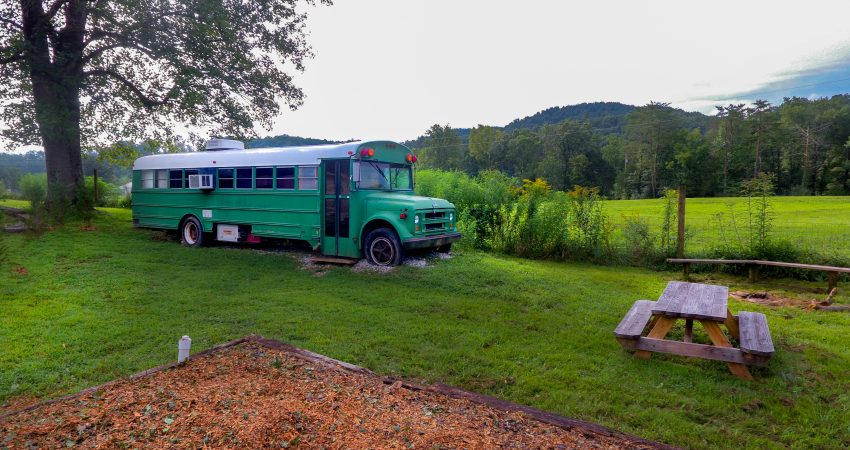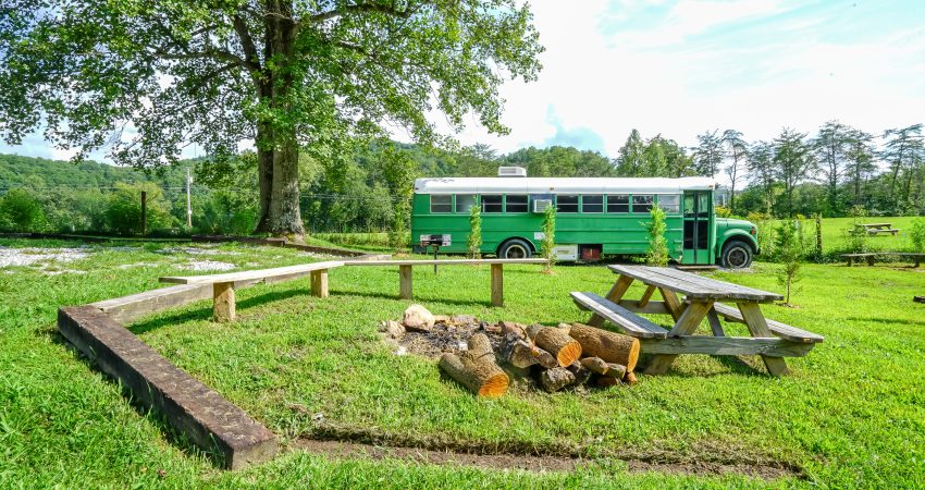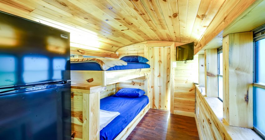 THE BRIMSTONE SCHOOL BUS is a uniquely renovated bus that sleeps 3 in an open room. Located near the junction of Winona and River Road. The bus has twin bunk beds and a small sitting area located in the front of the bus as well as a twin bed located at the rear of the bus. The Brimstone Bus provides a private bathroom shower stall as well as a small kitchenette and dining area complete with a microwave, refrigerator and coffee maker. Parking is shared with the Garage. Features include a 26” HD Flatscreen TV with a DVD player. For your enjoyment there is a fire pit located just outside of the bus as well as access to a pond for a relaxing evening of fishing after a day of riding the trails. There is a $50 cleaning fee per stay. When combined with SCHOOL HOUSE JUNCTION and THE GARAGE you have the ability to sleep 19 in one area. No Smoking, Please. There is a $85 security deposit that will be held on your credit card pending determination that upon departure the renter has left the cabin in the same condition as it was upon arrival, it will be released within a couple days of your departure. Our groovy little bus is definitely a unique little retreat worth telling your friends about. Please visit Cabin Rental Guidelines Page or FAQ’s Page and review our cancellation policy before booking. 3 Twin Beds | 1 Flat Screen TV | 1 DVD Player | Hot Spot Available for Email for $25/Stay First Come, First Serve | Charcoal Grill | Coffee Maker | Microwave | No Pets, Please | No Smoking, Please | Nice Mountain & Pond Views Pond Access | Close to Trail #6